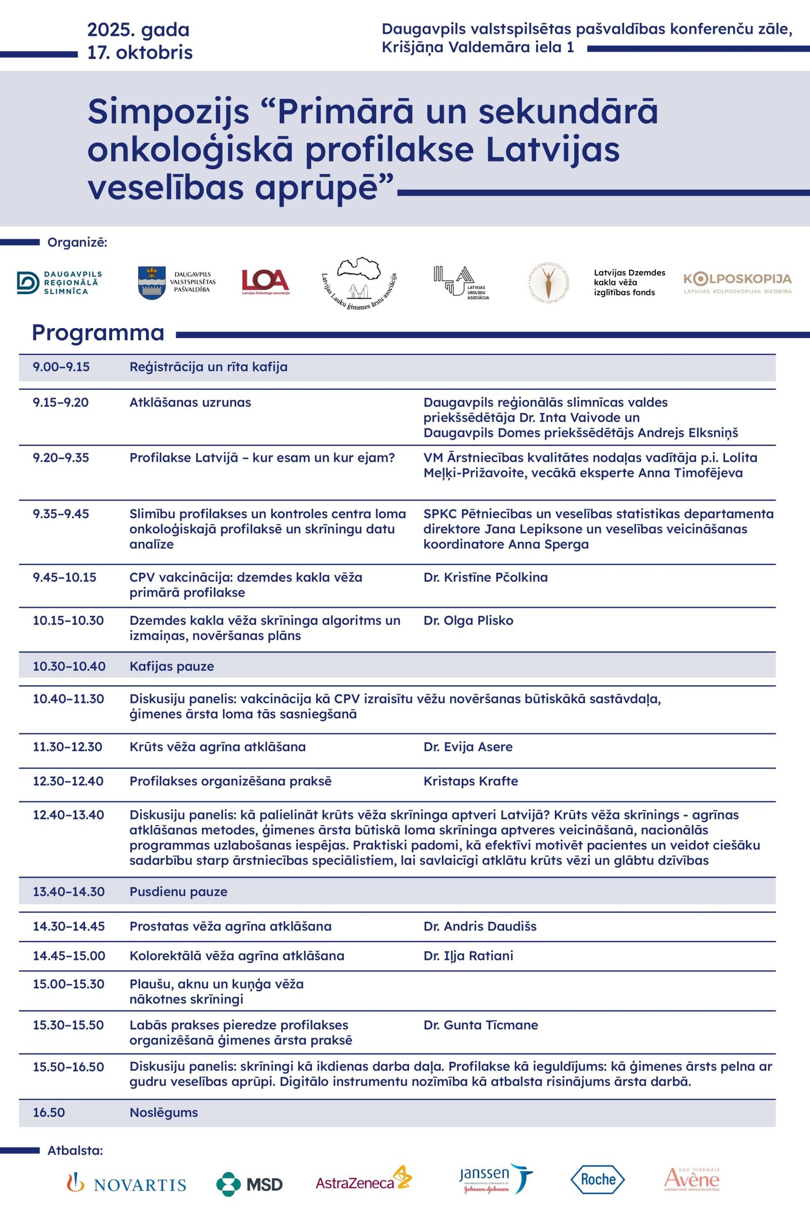 Simpozijs “Primārā un sekundārā onkoloģiskā profilakse Latvijas veselības aprūpē” notiks 17.10.2025. Daugavpils valstspilsētas pašvaldības konferenču zālē, Krišjāņa Valdemāra iela 1